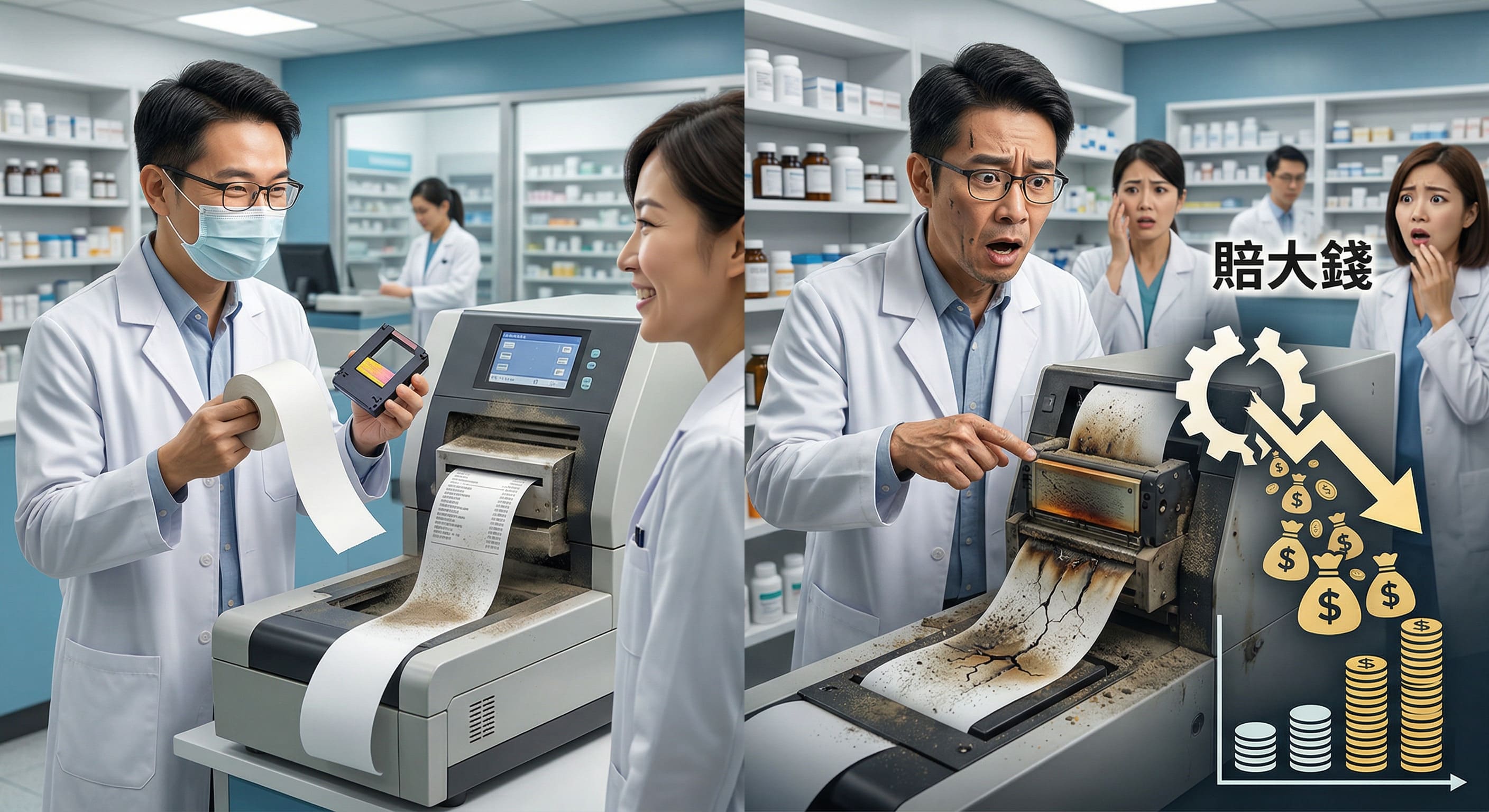 在醫療院所與大型藥局的日常營運中,採購部門經常面臨預算控制的壓力。許多經營者在斥資百萬導入高階分包系統後,為了壓縮每月的經常性支出,往往會將目光轉向價格低廉的副廠耗材。從企業財務的表面數據來看,採購便宜的紙捲或碳帶似乎能立刻帶來成本下降的錯覺。然而在精密醫療設備的領域,這種策略往往引發「因小失大」的連鎖反應。